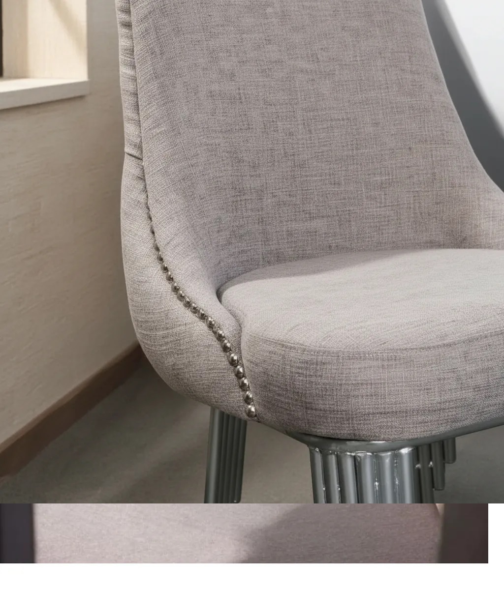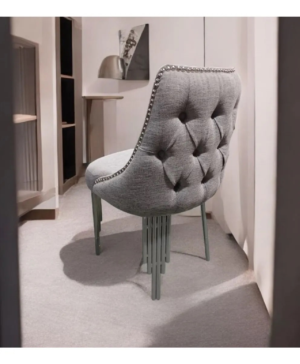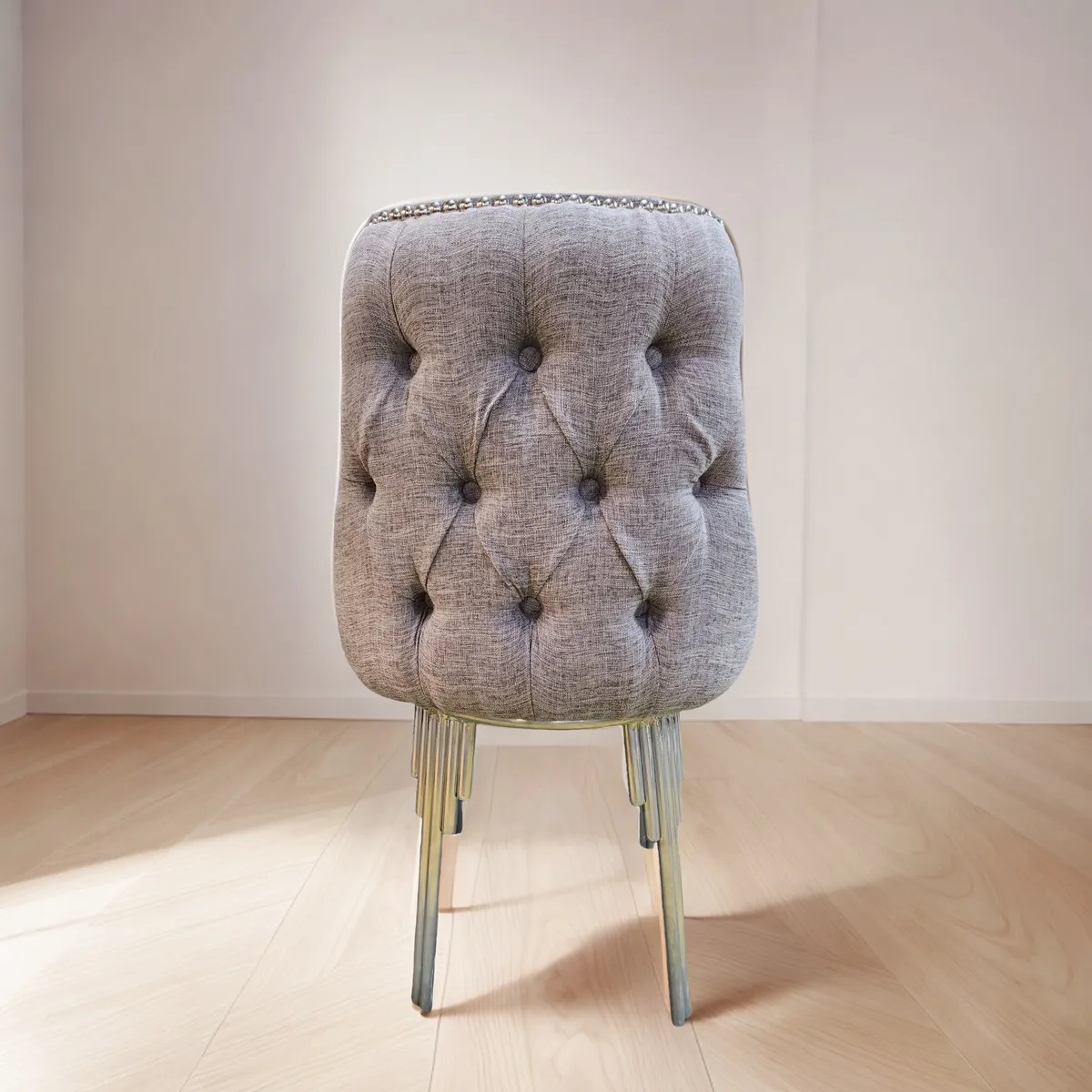 Silla de comedor madyson capitoné tapizada en lino antidesgarro, con patas de hierro epoxi. Elegante, cómoda y resistente. Hecha a mano en Argentina.