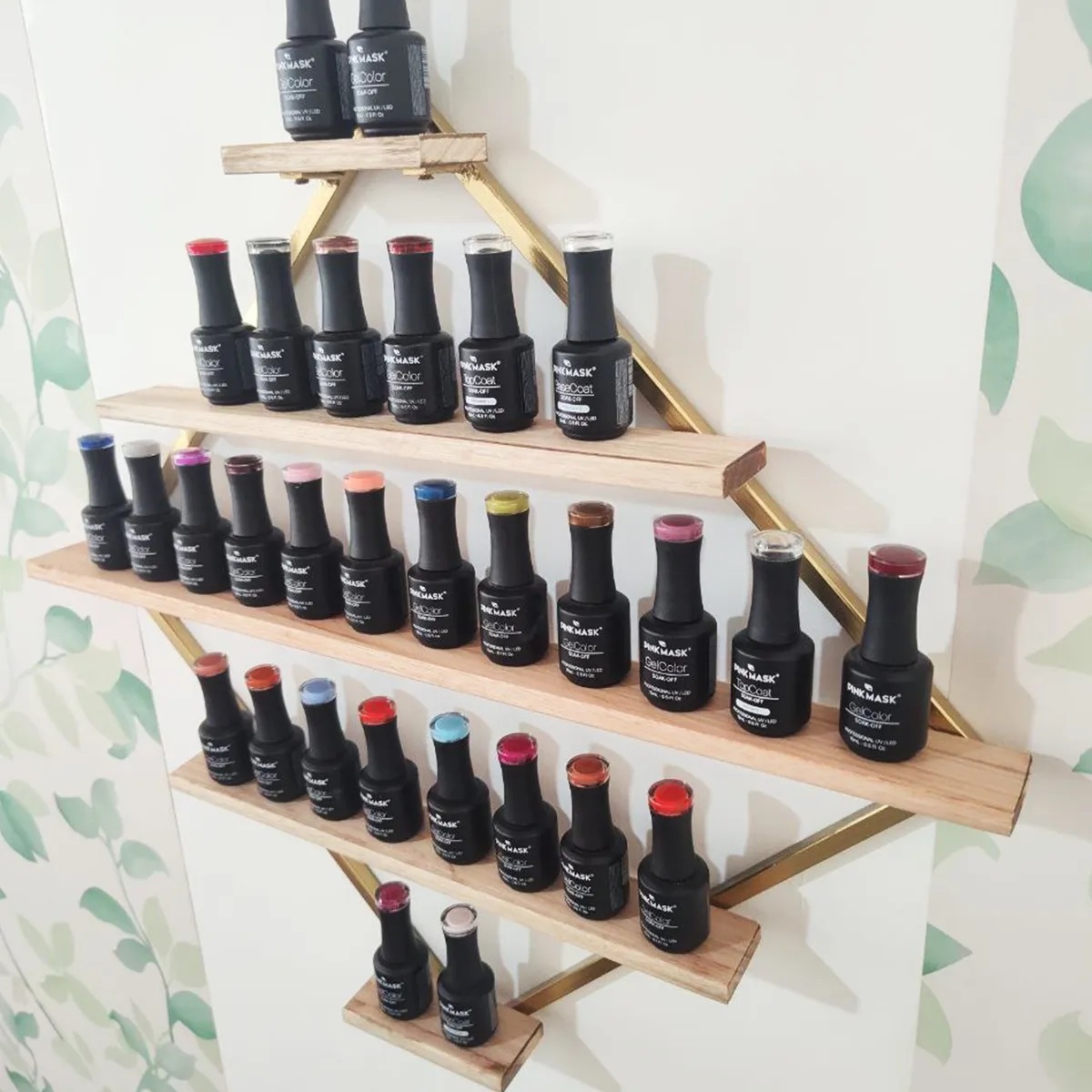 Nuestro porta esmaltes de diseño lujoso combina la funcionalidad de un organizador con la estética de una pieza de arte decorativa. Cuenta con una robusta estructura de hierro macizo color oro y cálidos estantes de madera maciza. Organiza de forma visible más de 40 esmaltes, añadiendo un toque premium a cualquier salón de belleza o tocador. ¡Estilo y orden en un solo producto!